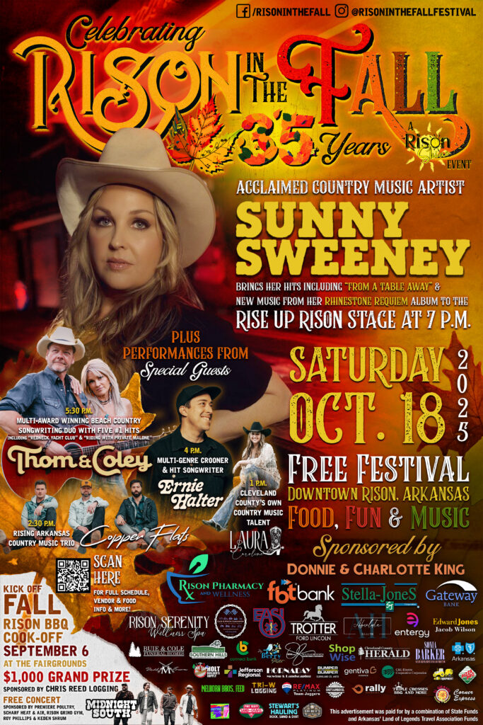 RISON – Rison’s premier event, the Rison in the Fall Festival will celebrate its 35th year Saturday, Oct. 18 with a headlining show from acclaimed country artist Sunny Sweeney bringing her honky-tonking Rhinestone Requiem Tour to Rison, Arkansas.