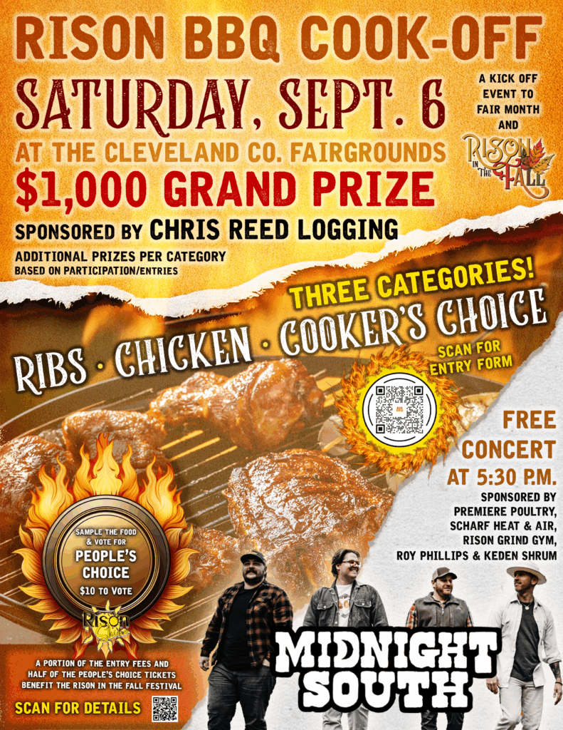 Rison Shine is set to expand the music and fun this year with a second event! The festivities will begin one month prior kicking of the fall season and fair month with the Rison BBQ Cook-Off Saturday, Sept. 6 at the Cleveland County Fairgrounds. This year’s cook-off will feature a grand prize of $1,000 sponsored by Chris Reed Logging, plus a free concert from one of the fall festival’s past acts, Midnight South.